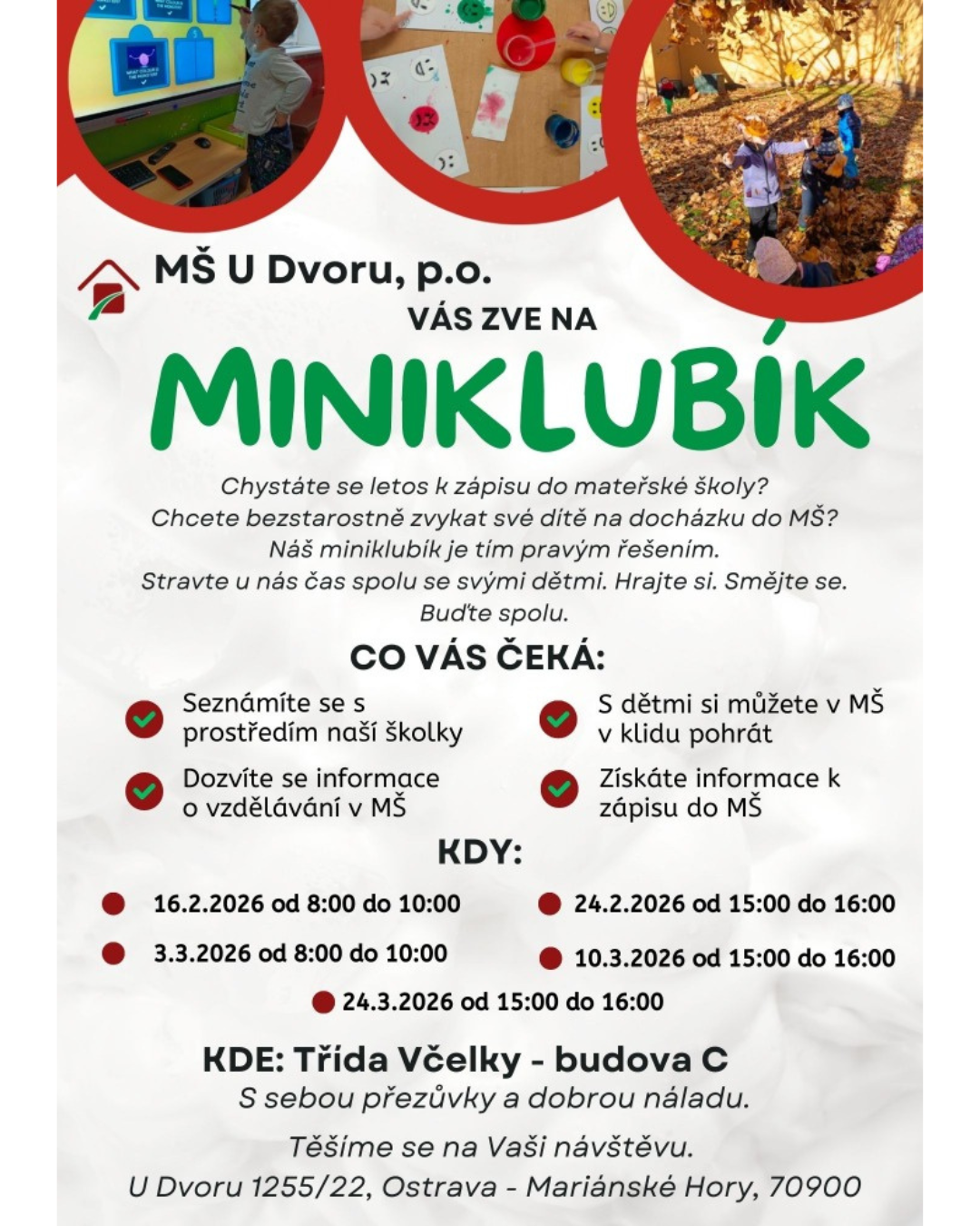 chceme Vás pozvat na tradiční akci MŠ, pro budoucí "školkáčky" tzv. MINIKLUBÍK. Jedná se o obdobu Dne otevřených dveří, který letos bude probíhat na MŠ celkem v pěti termínech. V průběhu tzv. MINIKLUBÍKU budete mít možnost prohlédnout si prostory MŠ, pohrát si zde se svým dítětem a zeptat se vedení MŠ na vše, co Vás o MŠ zajímá (předzápis, zápis do mš, provoz MŠ, platby, stravování, aktivity apod.). Můžete se zúčastnit všech pěti MINIKLUBÍKů nebo jen některých, dle Vašich časových možností. Na MINIKLUBÍK můžete přijít i s mladším nebo starším sourozencem budoucího "školkáčka".